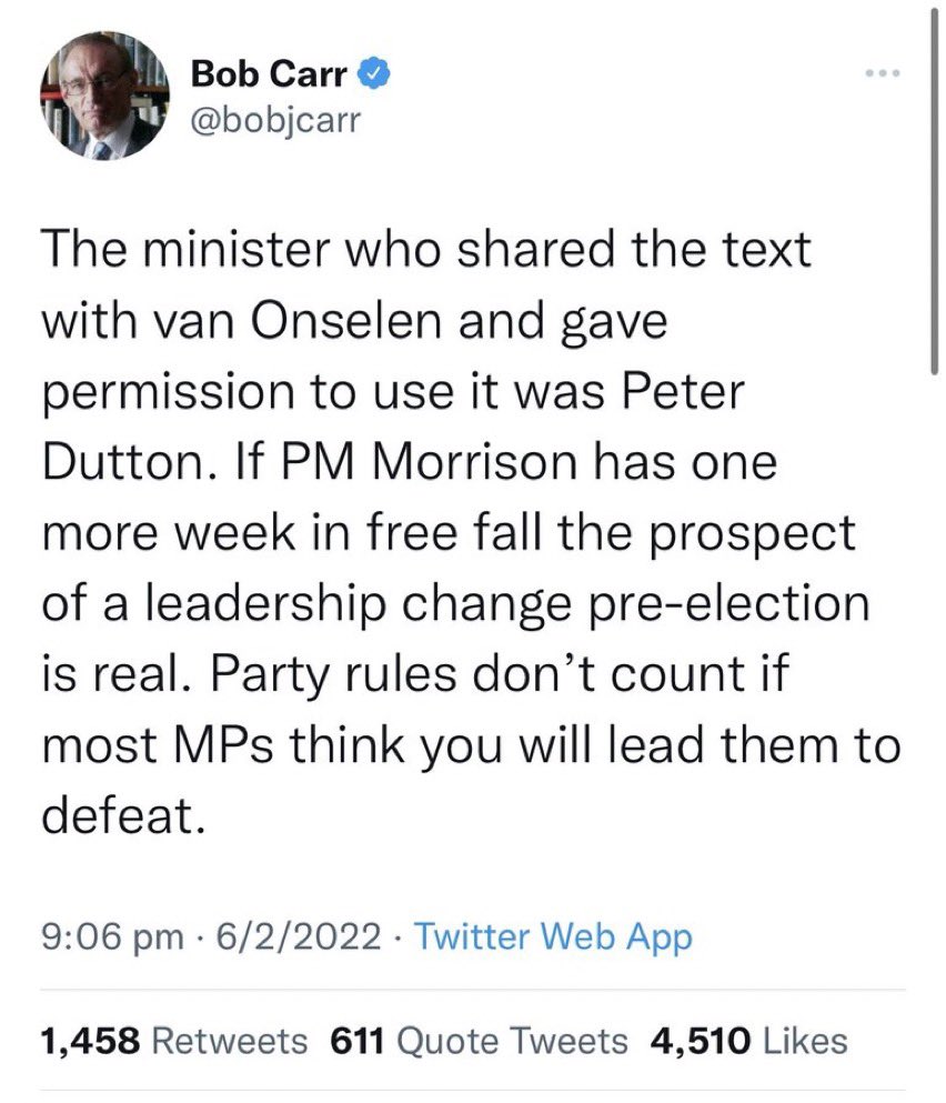 Mr Carrs tweet was still up on the social media platform on Monday morning. Former Labor foreign affairs minister Bob Carr has doubled down on his allegations that Peter Dutton is behind the leaking of explosive texts about the Prime Minister. EM Peter Dutton denies Bob Carrs claim that he leaked lyrics about Scott Morrison.